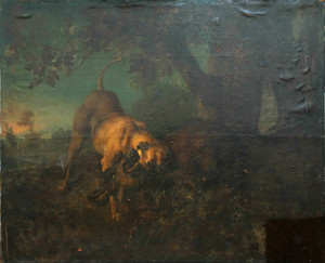 Jean-Baptiste Oudry, der Hofmaler am königlichen Hof in Versailles malte Mitte des 18. Jahrhunderts exotische Tiere, die sich Ludwig XV. in seinem Garten hielt. Darunter auch erstmals lebensgroß ein Rhinozeros. Die Auftragsarbeit der sogenannten „Menagerie“ traf aber nicht ganz den Geschmack des Königs, sodass es für Christian Ludwig Herzog von Mecklenburg Schwerin möglich war, sie zu erwerben. 13 Gemälde und Zeichnungen kamen nach Schwerin und lagerten über 250 Jahre im Depot. Durch die Auslagerung im Zweiten Weltkrieg hatte das Wildschwein am meisten gelitten. Nachdem nach neun Jahren Restaurierungsarbeit im Getty Museum in Los Angeles die stark ramponierten großformatigen Bilder wieder hergestellt waren, hat nun auch die Schweriner Restauratorin Katrin Lau ihr Werk am letzten beschädigten Bild des königlichen Zoos komplettiert. Risse wurden verklebt, die Leinwand verdoppelt, die Malschicht niedergelegt, die Firnis mit Lösungsmitteln abgetragen und abschließend Fehlstellen retuschiert und neuer Firnis veredelt.